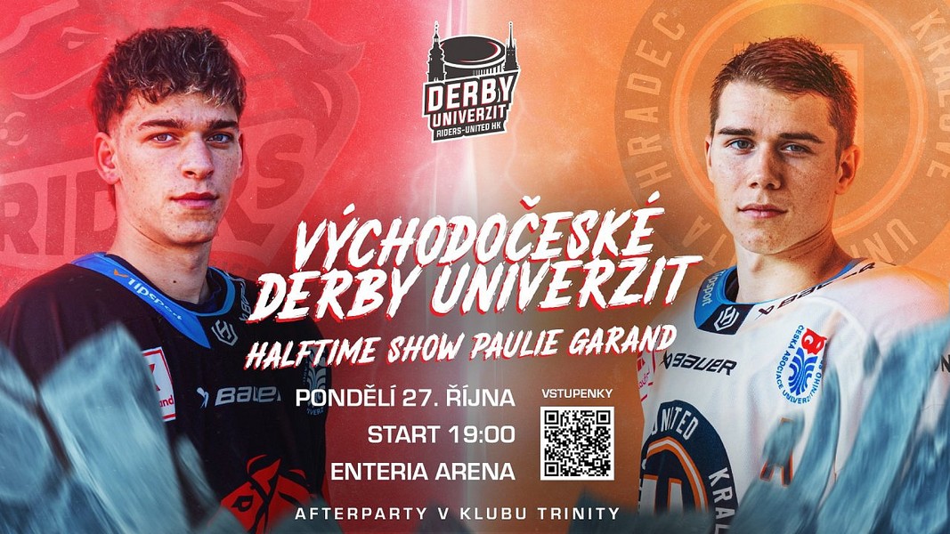 Připravte se na jednu z největších studentských akcí letošního podzimu! Východočeské derby univerzit mezi týmy Riders Univerzita Pardubice a UNIted HK není jen obyčejný hokejový zápas. Jde o neutichající rivalitu dvou měst, které na mapě dělí pár kilometrů. Tak kdo se stane vládcem východních Čech? A kdo zvedne pohár nad hlavu? Buďte u toho už 27. října od 19:00 v enteria areně.