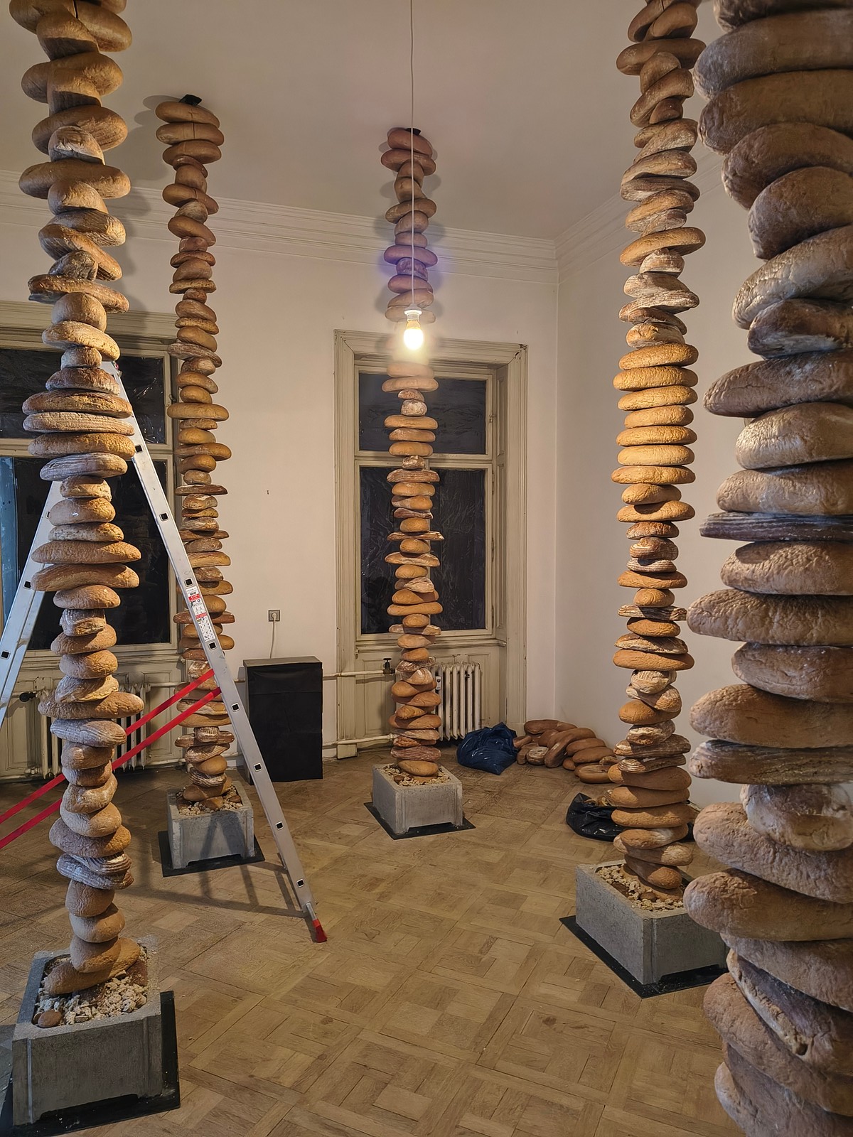 Instalace pracuje s celým prostorem místnosti. Vytváří vertikální pilíře z bochníků chleba, dynamické světelné proměny a zvukovou stopu složenou z ambientních tónů, šeptaných textů a zvuků praskajícího pečiva. Tato kombinace vytváří jedinečnou atmosféru, v níž se chléb mění v silný symbol a prostor sám se stává součástí sdělení.