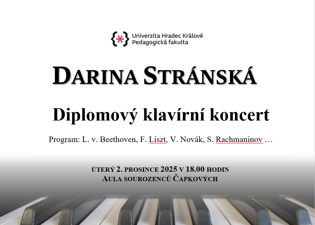 Přijměte pozvání na Diplomový klavírní koncert, který proběhne 2. prosince 2025 od 19:00 hodin v Aule sourozenců Čapkových.