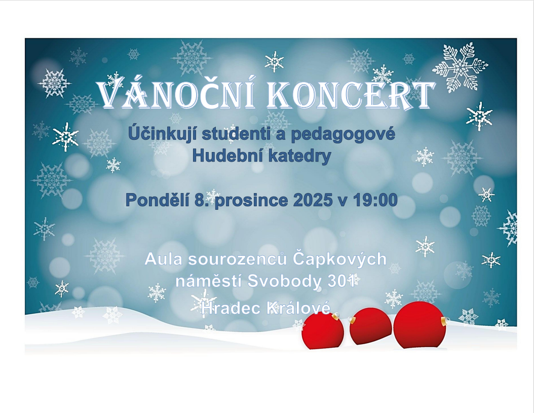 Přijměte pozvání na Vánoční koncert Hudební katedry, který proběhne 8. prosince 2025 od 19:00 hodin v Aule sourozenců Čapkových.