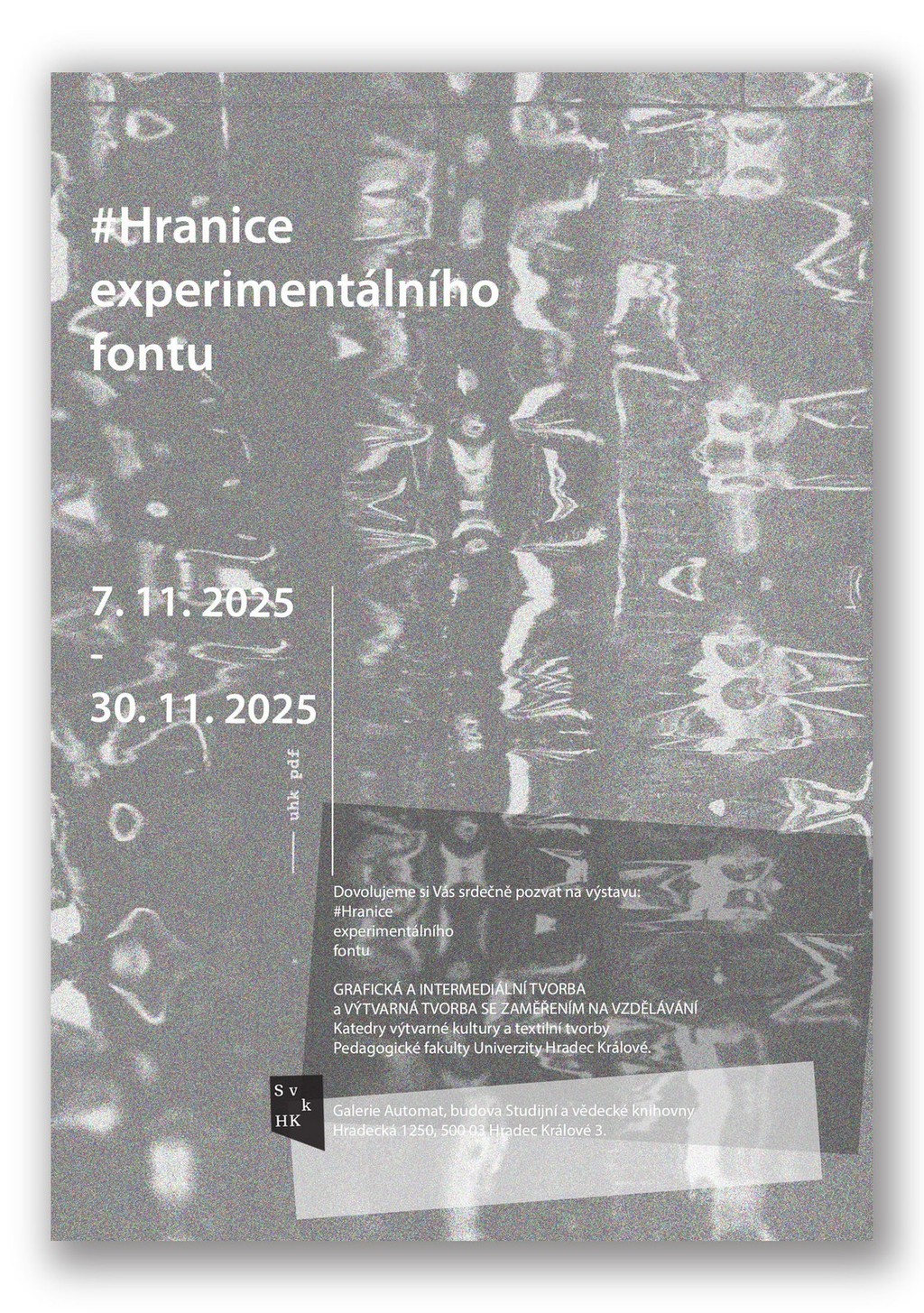 Výstava představuje výběr prací studentů studijních programů Grafická a intermediální tvorba a Výtvarná tvorba se zaměřením na vzdělávání. Součástí expozice jsou také experimentální fonty, navržené tak, aby prolomily konvenční pravidla typografie a vytvořily vizuálně originální a inovativní písma. Tyto fonty zkoumají hranice čitelnosti a estetiky prostřednictvím neobvyklých tvarů, asymetrie a neortodoxních uspořádání znaků. Jsou ideální pro použití v uměleckých projektech, plakátech, názvech i v dalších kontextech, kde je klíčová vizuální expresivita a originalita. Inspirují se moderním uměním, abstrakcí a digitální estetikou, přičemž kladou důraz na experimentální přístup k tvaru i významu. Návštěvníci budou mít možnost shlédnout autorské knihy a experimentální fonty, které vznikly během zimního semestru pod vedením MgA. Petra Hůzy. Výstava je realizována ve spolupráci se Studijní a vědeckou knihovnou v Hradci Králové.