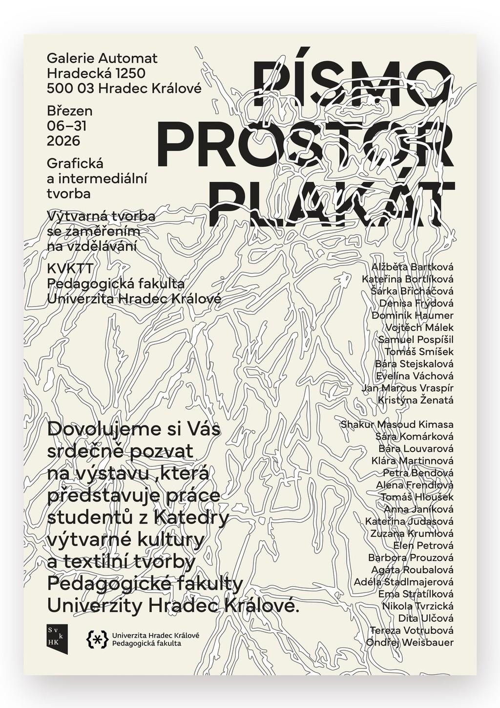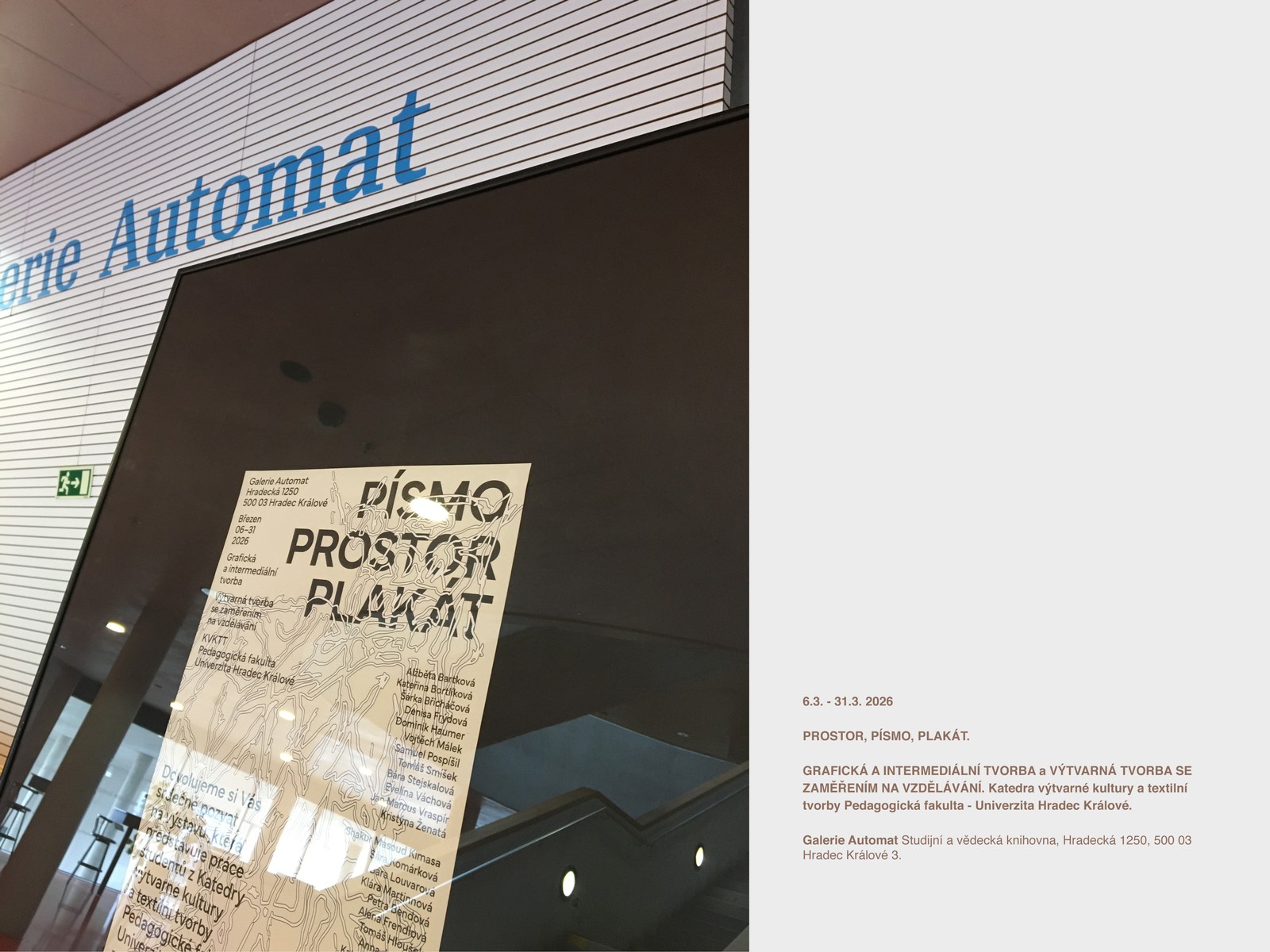 Výstava představuje práce studentů studijních programů Grafická a intermediální tvorba a Výtvarná tvorba se zaměřením na vzdělávání. Ukazuje, jak lze propojit prostor, písmo a plakát v rámci současného designu a typografie.