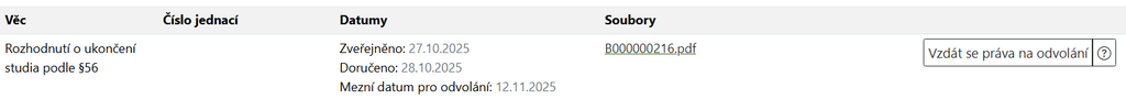 Písemnosti jsou k dispozici v IS/STAG - Moje studium - Nahlížení do spisu. Pokud se jedná o písemnost, u které je možnost vzdát se odvolání (např. rozhodnutí o ukončení studia pro nesplnění podmínek, přerušení studia ...), nabízí se tato možnost studentovi přímo u písemnosti.