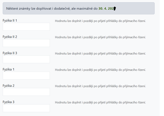 V případě, že studijní program vyžaduje zadání výsledků z předchozího studia, vyplňujte známky následovně (na snímku je uvedený předmět Fyzika,):