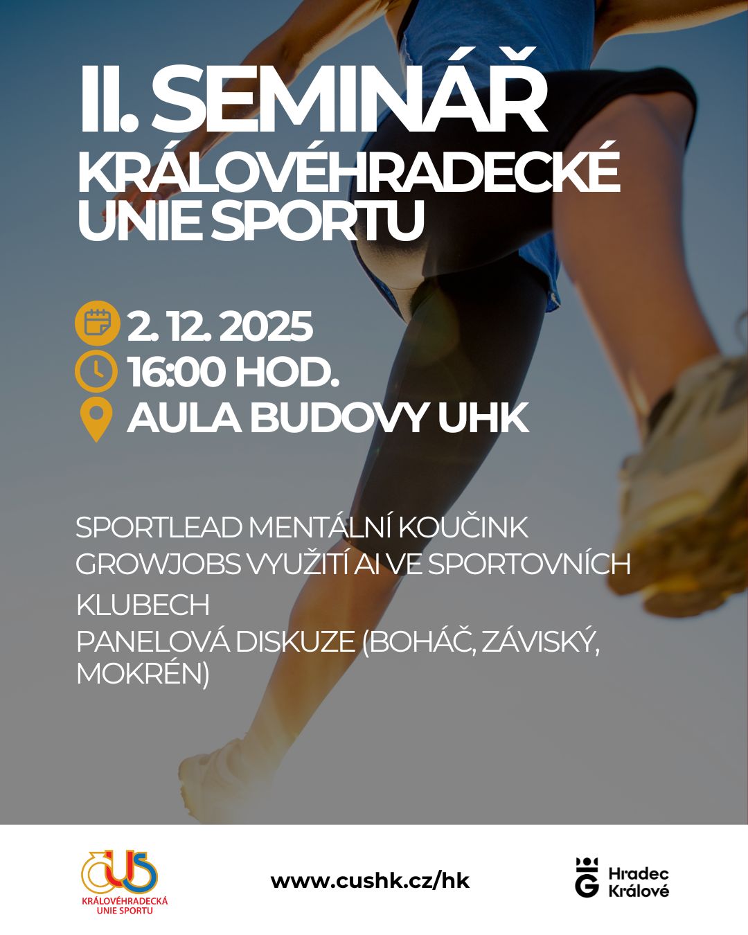 Královéhradecká unie sportu připravila pro sportovní spolky, kluby, organizace druhý ročník odborného semináře pro sportovní organizace 2025. Seminář se uskuteční v pondělí 2. prosince od 16 hodin v aule Univerzity Hradec Králové. Seminář nabídne program zaměřený na moderní trendy ve sportu, umělou inteligenci v řízení sportovních organizací, dotační příležitosti i mentální přípravu sportovců a trenérů.