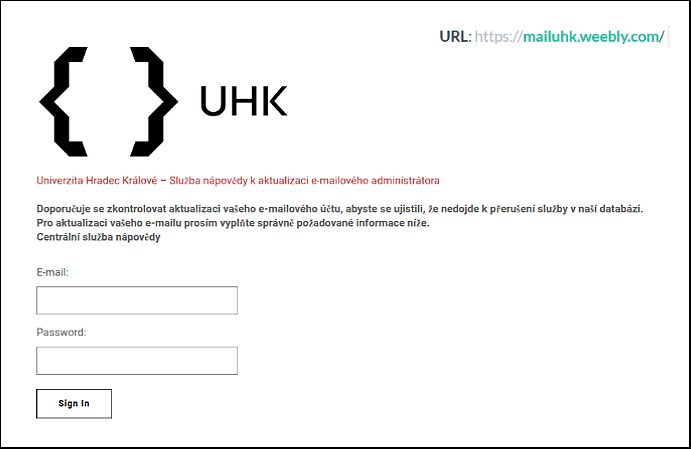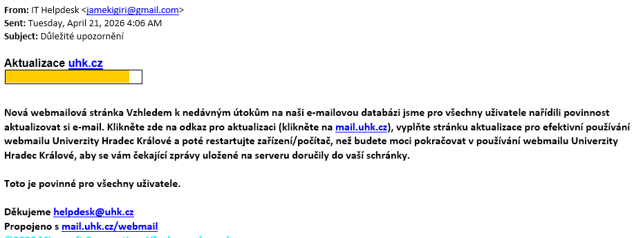 Jedná se o níže uvedenou zprávu. Byly provedeny kroky k blokaci podvržené stránky. Pokud někdo přihlašovací údaje před blokací podvodné webové stránky vyplnil, doporučujeme provést neprodleně změnu hesla u univerzitního účtu a oznámit tuto skutečnost pracovníkům OIT.