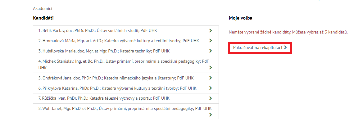Po iniciaci tlačítka "Volit" se zobrazí seznam kandidátů za příslušnou komoru. Pokud jste student zobrazí se studentská komora, v opačném případě se zobrazí komora akademická. V případě, že chcete zvolit některé jméno ze seznamu stačí na něj kliknout. Toto jméno se přesune doprava do sloupce "Moje volba". Dle pravidel voleb můžete vybrat různý počet kandidátů. Dle ukázky pravidel výše lze vybrat 1 - 3 kandidáty/kandidátky, aby byl hlas platný. Systém neumožňuje vybrat více jak 3 kandidáty. V případě, že si nechcete vybrat žádné kandidáty a přesto chcete hlasovat můžete odevzdat prázdný hlasovací lístek. Tento lístek nepřiřadí hlas žádné osobě z kandidátní listiny. U kontroly odeslání hlasu budete upozorněni, že odesíláte prázdný hlasovací lístek.