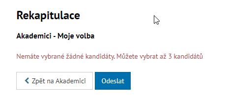 Rekapitulace zobrazuje, volbu daného voliče a umožňuje odeslat hlas/y přes tlačítko "Odeslat". V případě, že chcete odeslat prázdný hlasovací lístek systém Vás o tom informuje v oblasti, kde by byly zobrazeny osoby v předchozí části.