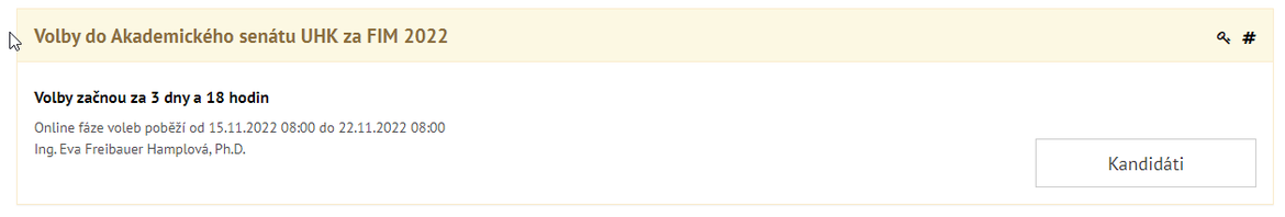 V rámci Intranetu UHK v sekci Aplikace je k dispozici interaktivní dlaždice, která obsahuje veškeré informace o volbách v daný časový okamžik.