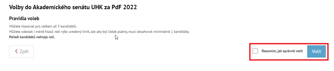 V případě, že volby již začaly a chcete se zúčastnit hlasování, můžete tak provést po přihlášení na stránce volby.uhk.cz a u volby za fakultu, ke které spadáte, můžete zvolit tlačítko "Volit". Po stisknutí tlačítka pro volbu zobrazí informace o pravidlech daných voleb, kde je třeba zaškrtnout možnost, že jste srozuměni s pravidly voleb.