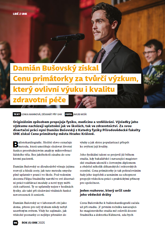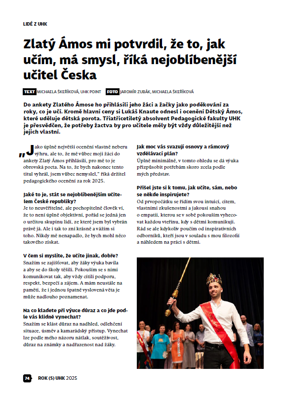 Magazín Rok (s) UHK 2025 přináší ohlédnutí za zásadními událostmi a úspěchy Univerzity Hradec Králové. Vypráví o nové univerzitní datové laboratoři na FF, výročí 15 let od založení PřF, otevření zrekonstruované budovy C (PdF), výročí 20 let založení FF nebo o navázání zahraničních spoluprací (FIM). Líčí také příběhy zajímavých akademiků a akademiček a jejich projektů na UHK. Studující UHK excelovali v mezinárodních i lokálních soutěžích, spolupracovali na významných projektech.