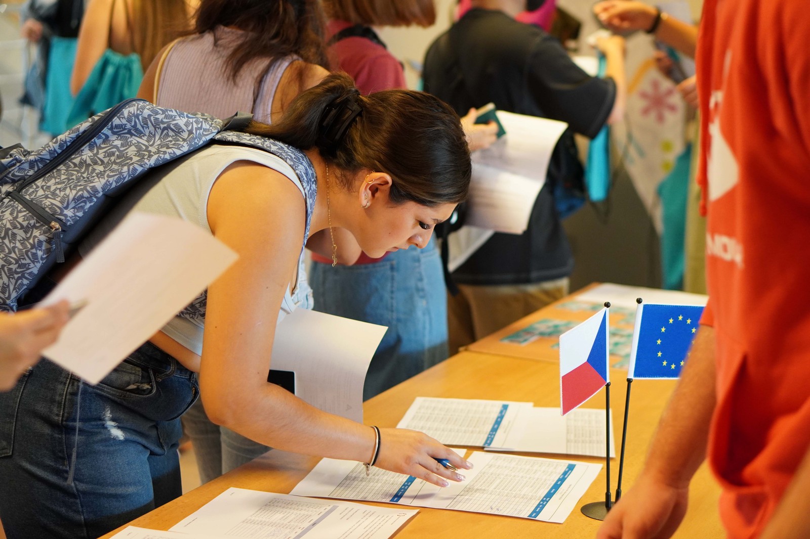 We organized a welcome meeting on September 14, 2023 where students registered, got the ISIC and welcome bag with a lovely FIM T-shirt. During the presentation they were informed about UHK, FIM, courses, services offered by the university, how to behave gently towards nature - waste sorting, and of course they got information about the Czech Republic and Hradec Králové.